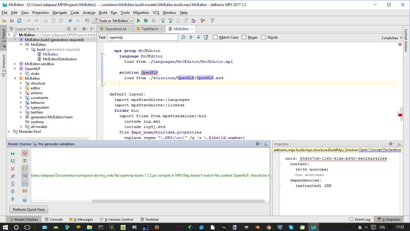 Checking the OpenNLP solution (which it's a a sort of wrapper for an external library, a stub starting from a .jar), it says no problems. Trying to rebuild it results in a "Rebuild aborted: nothing to do".