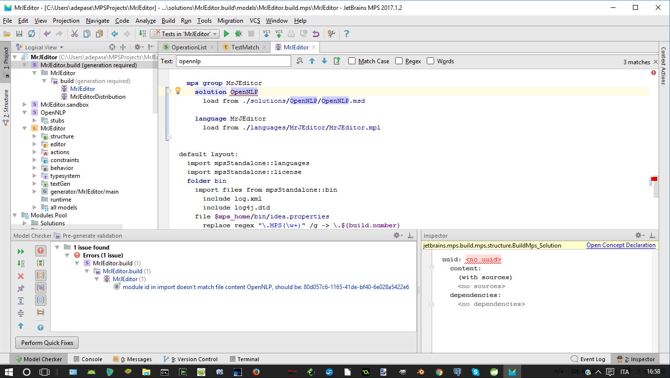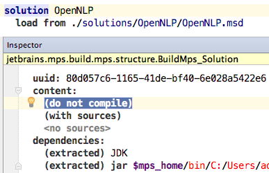 To be more precise: I tried to remove the solution declaration from the build script. Is the declaration you suggested me to remove? (if it's from the build script, I cannot imagine others). Then I rebuilt (3 errors , among which a broken reference and an unresolved reference to OpenNLP; not so odd), readded the declaration (same 3 errors), performed a quick fix (1 error: the same you can see in the image below).