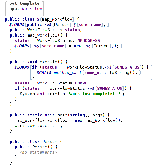 Using the declaration of Persons (pre-defined) in the 2nd line of my language code, I am able to generate the required fields using a $LOOP$ macro over node.persons where node refers to rrot concept Workflow and persons refers to PersonReferences as shown below:
