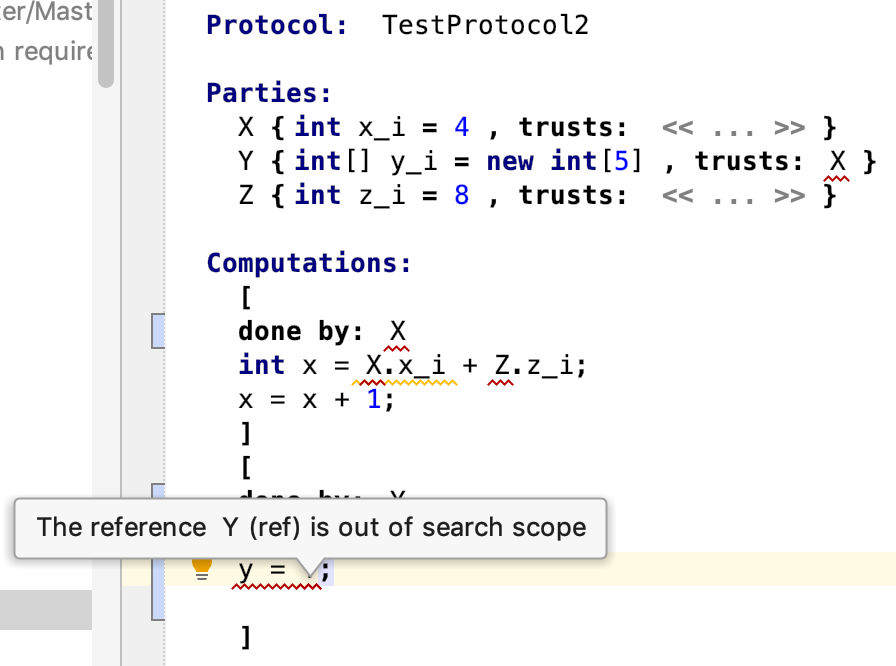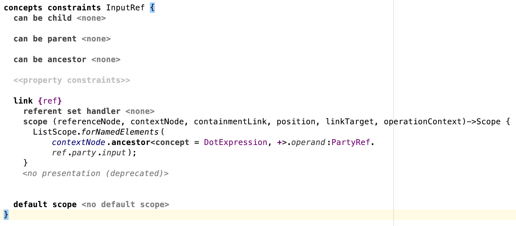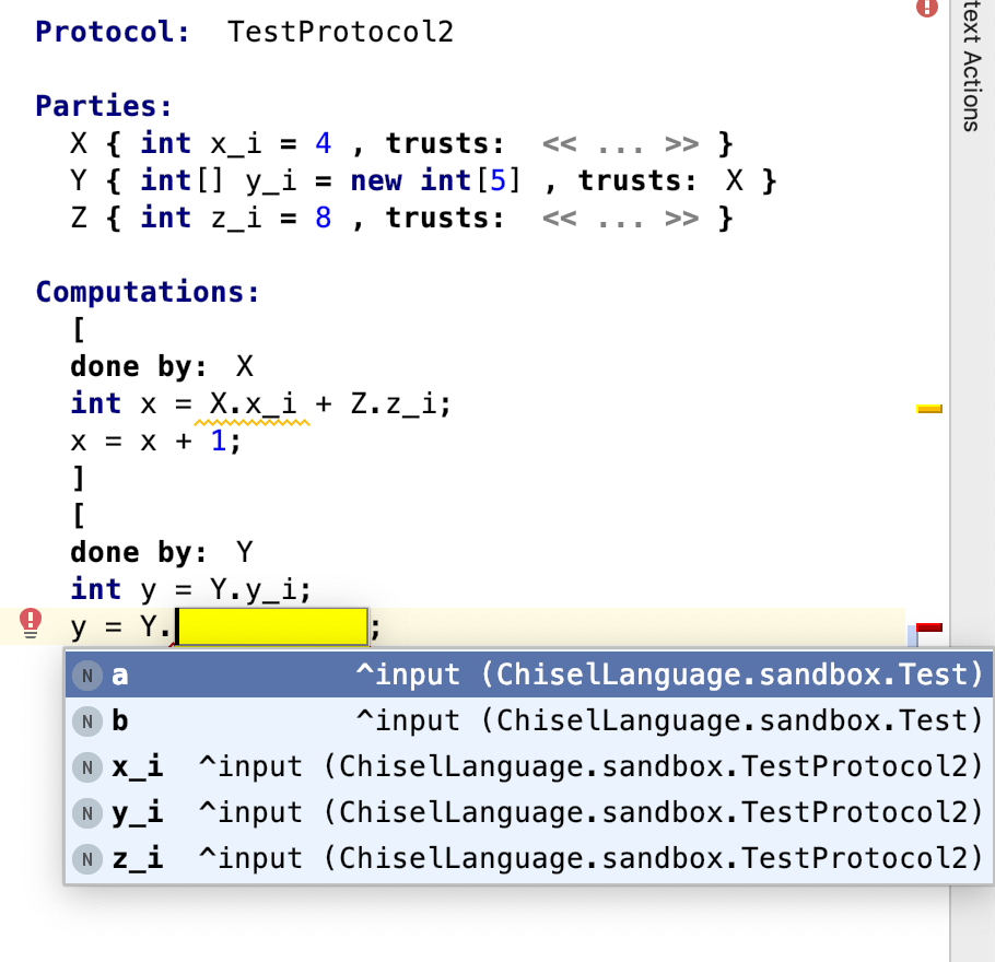 But as you can see, the auto-complete menu includes the input from all the parties, not just the one from which it is accessed (here Y). I tried to add "can be child" constraints to InputReference, so that the operand and operation of the DotExpression have to point to the same Party. My attempt is as follows: