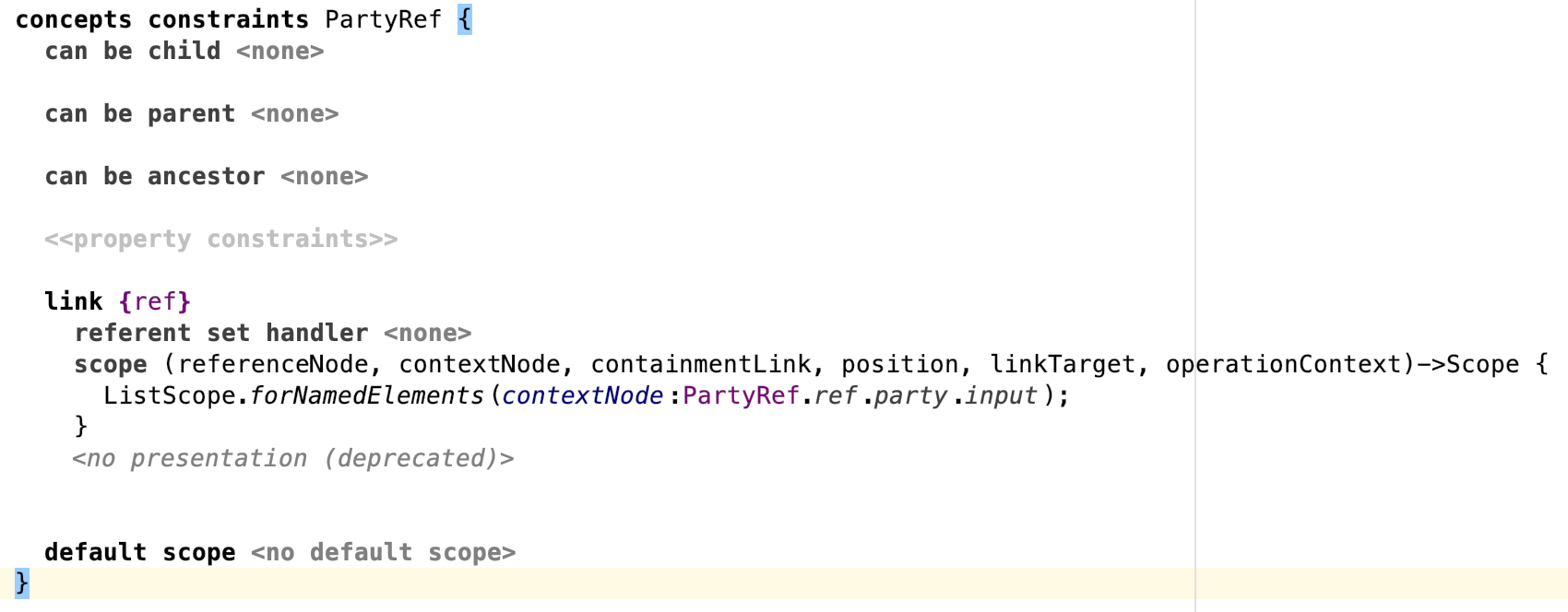 I am not sure I understand completely though. You suggest that I should build a scope based on the left side of the Dot Expression, which is a PartyRef. So I tried adding a reference scope on "ref" in PartyRef, the way you suggested, as follows: