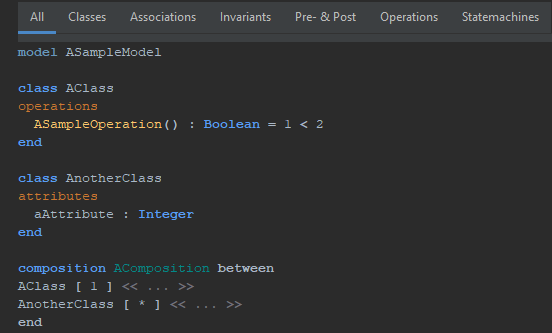 The classes tab should filter for classes, while the associations tab should only display associations like the composition at the bottom.